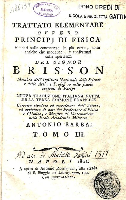 Titolo: Trattato elementare ovvero principj di fisica fondati sulle conoscenze le piu certe, tanto antiche che moderne, e confermati colla sperienza del signor Brisson … 3