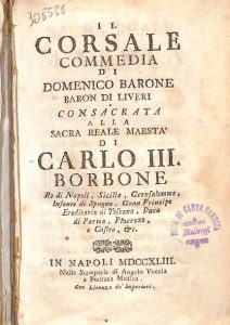 IL *CORSALE COMMEDIA DI DOMENICO BARONE BARON DI LIVERI CONSACRATA ALLA SACRA REALE MAESTÀ DI CARLO 3. BORBONE RE DI NAPOLI, SICILIA, GERUSALEMME …