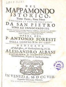 DEL MAPPAMONDO ISTORICO, CIOÈ ORDINATA NARRAZIONE DEI QUATTRO SOMMI IMPERII DEL MONDO DA NINO PRIMO IMPERATOR DEGLI ASSIRII SINO AL REGNANTE LEOPOLDO AUSTRIACO. E DELLA MONARCHIA DI CHRISTO DA S. PIETRO PRIMO PAPA SINO A’ NOSTRI DÌ CON LE IMPRESE PIÙ ILLUSTRI DELL’ISTORIA ANTICA, E MODERNA. OPERA DEL P. ANTONIO FORESTI DELLA COMPAGNIA DI GESÙ, TOMO TERZO, PARTE SECONDA