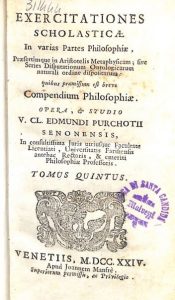 INSTITUTIONES PHILOSOPHICÆ AD FACILIOREM VETERUM, AC RECENTIORUM PHILOSOPHORUM LECTIONEM COMPARATÆ OPERA, & STUDIO V. CL. EDMUNDI PURCHOTTI …. : TOMUS QUINTUS : EXERCITATIONES SCHOLASTICÆ IN VARIAS PARTES PHILOSOPHIÆ, PRÆSERTIMQUE IN ARISTOTELIS METAPHYSICAM; SIVE SERIES DISPUTATIONUM ONTOLOGICARUM NATURALI ORDINE DISPOSITARUM: QUIBUS PRÆMISSUM EST BREVE COMPENDIUM PHILOSOPHIÆ. OPERA, & STUDIO V. CL. EDMUNDI PURCHOTII ..