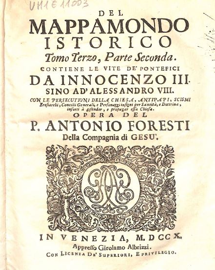 DEL MAPPAMONDO ISTORICO, CIOÈ ORDINATA NARRAZIONE DEI QUATTRO SOMMI IMPERII DEL MONDO DA NINO PRIMO IMPERATOR DEGLI ASSIRII SINO AL REGNANTE LEOPOLDO AUSTRIACO. E DELLA MONARCHIA DI CHRISTO DA S. PIETRO PRIMO PAPA SINO A’ NOSTRI DÌ CON LE IMPRESE PIÙ ILLUSTRI DELL’ISTORIA ANTICA, E MODERNA. OPERA DEL P. ANTONIO FORESTI DELLA COMPAGNIA DI GESÙ, TOMO QUARTO, PARTE SECONDA