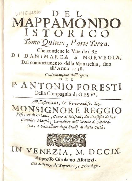 DEL MAPPAMONDO ISTORICO, CIOÈ ORDINATA NARRAZIONE DEI QUATTRO SOMMI IMPERII DEL MONDO DA NINO PRIMO IMPERATOR DEGLI ASSIRII SINO AL REGNANTE LEOPOLDO AUSTRIACO. E DELLA MONARCHIA DI CHRISTO DA S. PIETRO PRIMO PAPA SINO A’ NOSTRI DÌ CON LE IMPRESE PIÙ ILLUSTRI DELL’ISTORIA ANTICA, E MODERNA. OPERA DEL P. ANTONIO FORESTI DELLA COMPAGNIA DI GESÙ, TOMO QUINTO, PARTE QUARTA