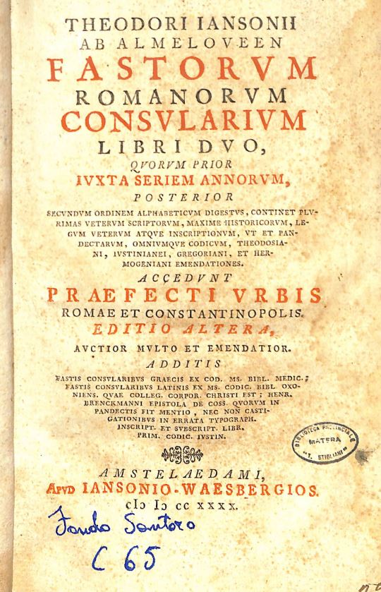 Titolo: Fastorum Romanorum consularium libri duo, quorum prior iuxta seriem annorum, posterior secundum ordinem alphabeticum digestus, continet plurimas veterum scriptorum … Accedunt praefecti vrbis Romae et Constantinopolis. – Editio altera, auctior multo et emendatior …