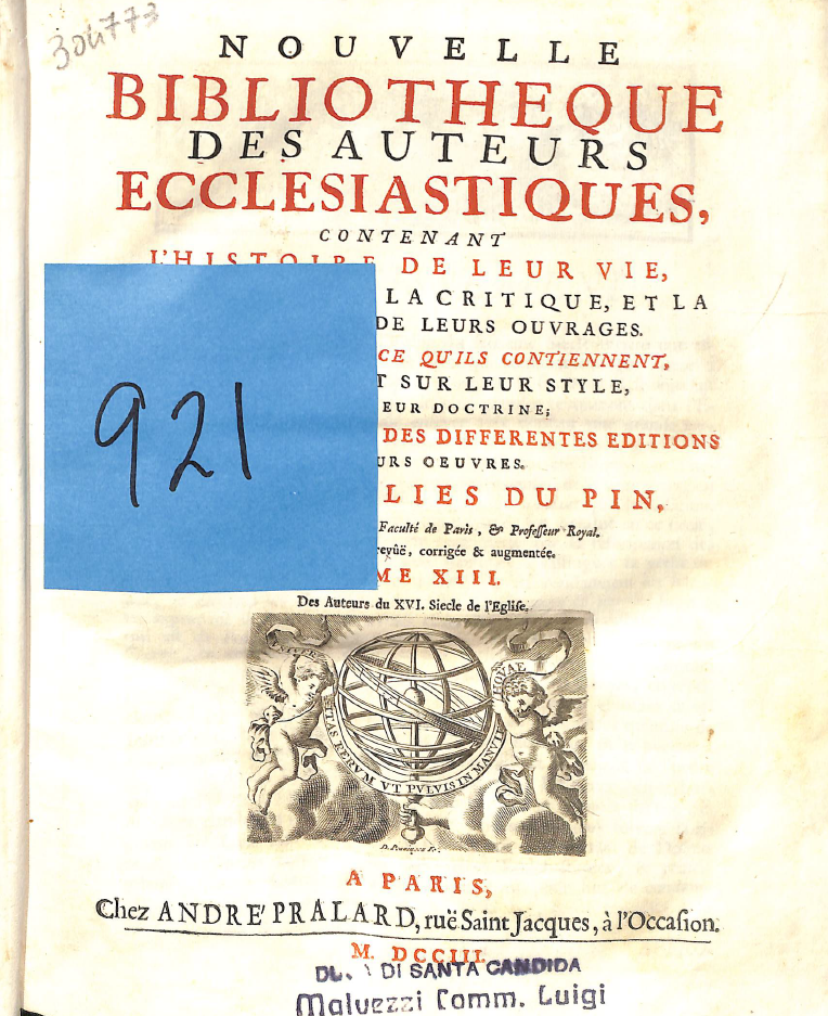 NOUVELLE BIBLIOTHEQUE DES AUTEURS ECCLESIASTIQUES, CONTENANT L’HISTOIRE DE LEUR VIE, LE CATALOGUE, LA CRITIQUE, ET LA CHRONOLOGIE DE LEURS OUVRAGES; LE SOMMAIRE DE CE QU’ILS CONTIENNENT: UN JUGEMENT SUR LEUR STYLE, ET SUR LEUR DOCTRINE; ET LE DENOMBREMENT DES DIFFERENTES EDITIONS DE LEURS OUVRES. PAR M.RE L. ELLIES DU PIN, .. : TOME CINQUIÈME : DES AUTEURS DU FIXIÉME SIECLE DE L’EGLISE – Tomo XIII – LIBRO I – Parte 1