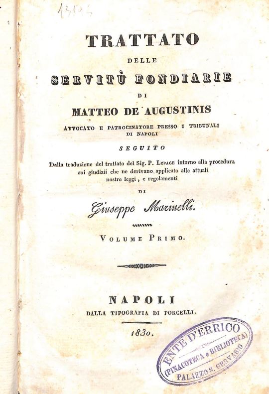 TRATTATO DELLE SERVITU FONDIARIE DI MATTEO DE AUGUSTINIS AVVOCATO E PATROCINATORE PRESSO I TRIBUNALI DI NAPOLI SEGUITO DALLA TRADUZIONE DEL TRATTATO DEL SIG. P. LAPAGE INTORNO ALLA PROCEDURA SUI GIUDIZII CHE NE DERIVANO, APPLICATO ALLE ATTUALI NOSTRE LEGGI, E REGOLAMENTI DI GIUSEPPE MARINELLI. VOLUME PRIMO[-SECONDO]